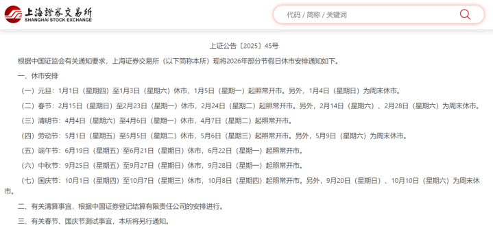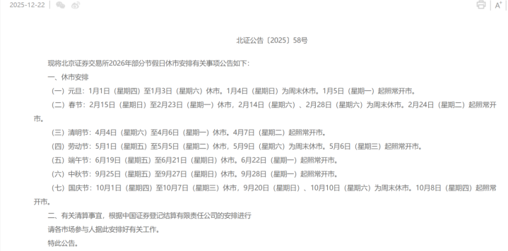 12月22日最专业股票配资论坛,上海、深圳和北京三大证券交易所发布通知,对2026年部分节假日休市作出安排。根据安排,周末休市加上春节,A股在春节期间休市时间将长达10天。2月24日(大年初八)起开市。